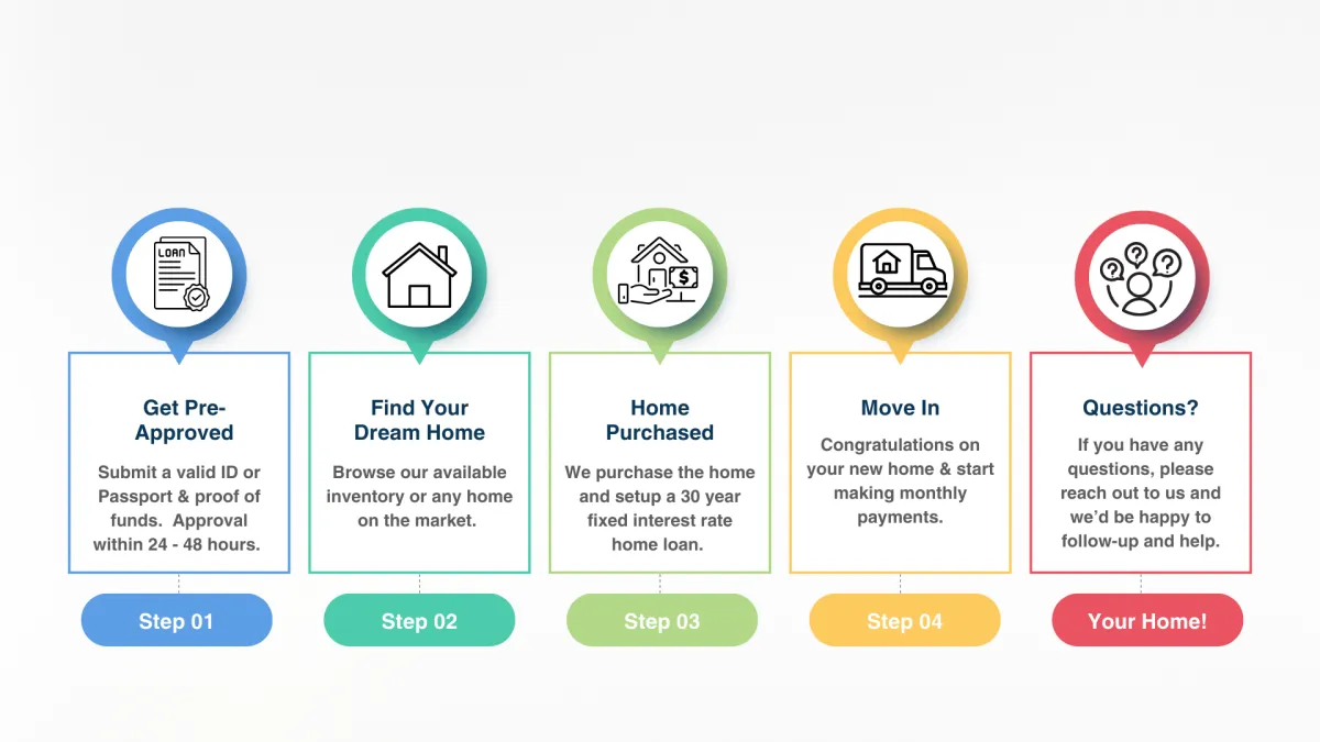 We’re here to ensure that your house buying experience is smooth and hassle-free as possible. Please at [email protected] if you have further questions that haven’t been answered on our site. We will be happy to assist you!